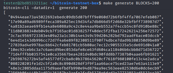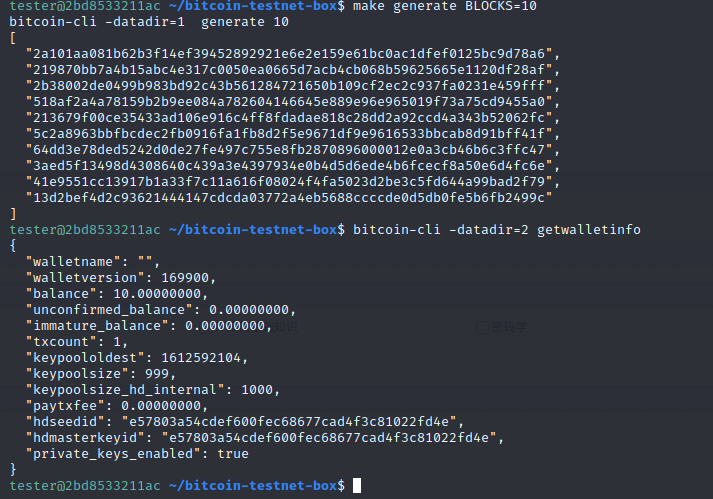 如果需要修改make相关的命令,则可以修改docker环境中的 /home/tester/bitcoin-testnet-box 路径下的Makefile脚本