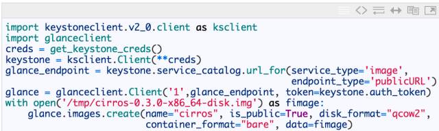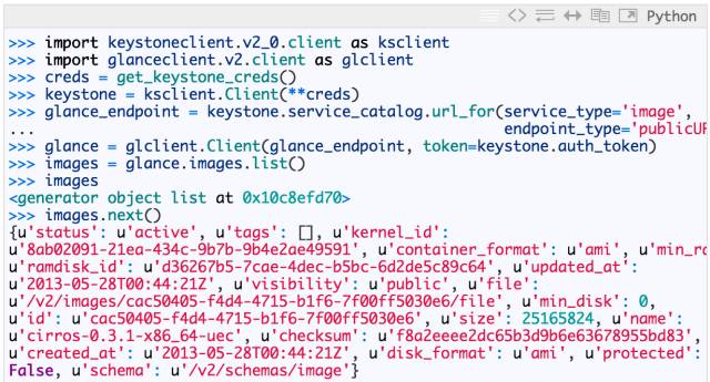 OpenStack Image (glance) Python API 在执行初始身份验证时与 Compute API 有一些细微的差别。glance API 依赖于必须从 keystone API 获取的信息: