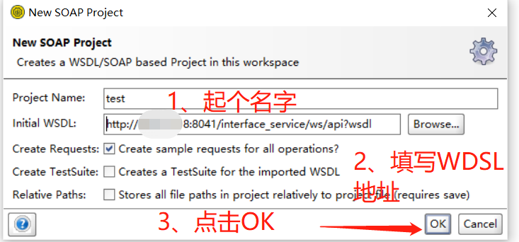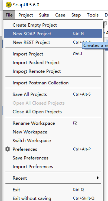 ①在接口项目开启之后,打开工具soapUi,新建(file→New SOAP Project),如下图所示: