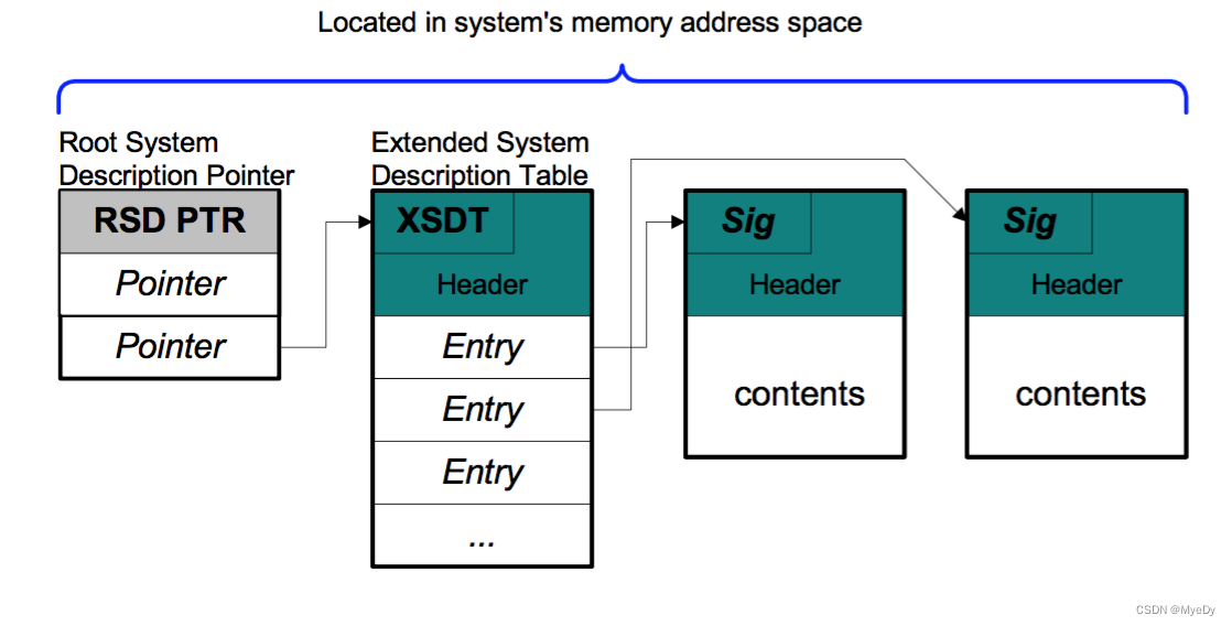 整个ACPI表以RSDP(Root System Descriptor Pointer Table,根系统描述符指针表)为入口点,存放了R(X)DST的地址。RSDT(根系统说明表)是32位地址,XSDT是64位地址,其功能一样。