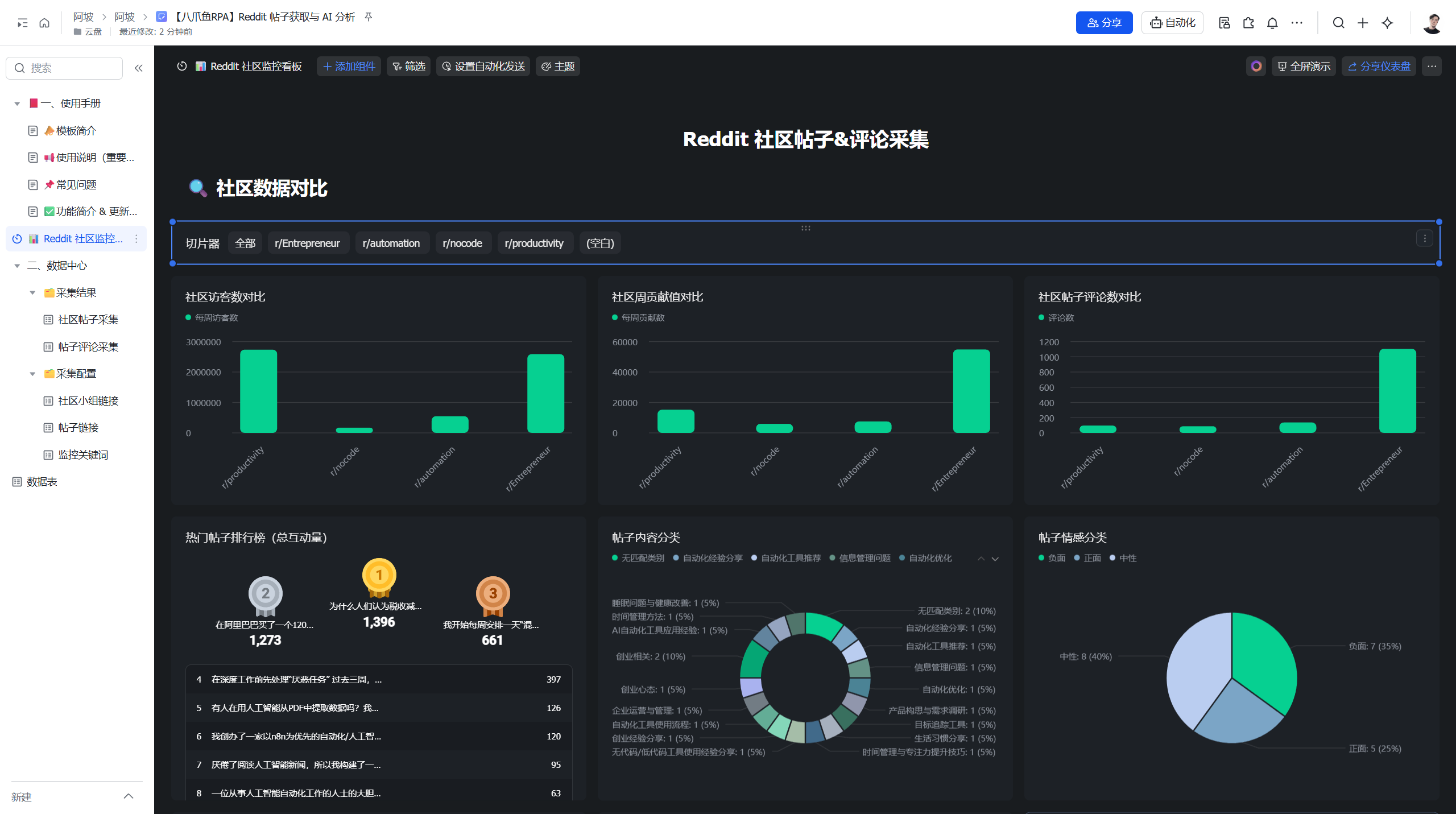 现在,你已拥有了一套开箱即用的自动化舆情监控解决方案。它深度整合了 Reddit 数据采集与飞书多维表格/BI 看板,能够持续为你完成关键词与热门帖的舆情监控,将你从繁琐、重复的社群数据搬运工作中彻底解放,使舆情监控变得系统、高效且一目了然。