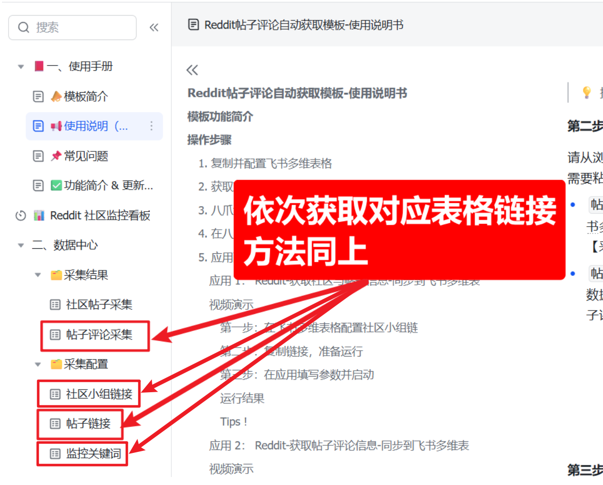 请注意:创建副本后,该文档将归属于你的飞书账号。所有采集结果、监控仪表盘等均可在此文档中查看(通过左侧菜单切换)。