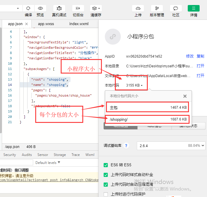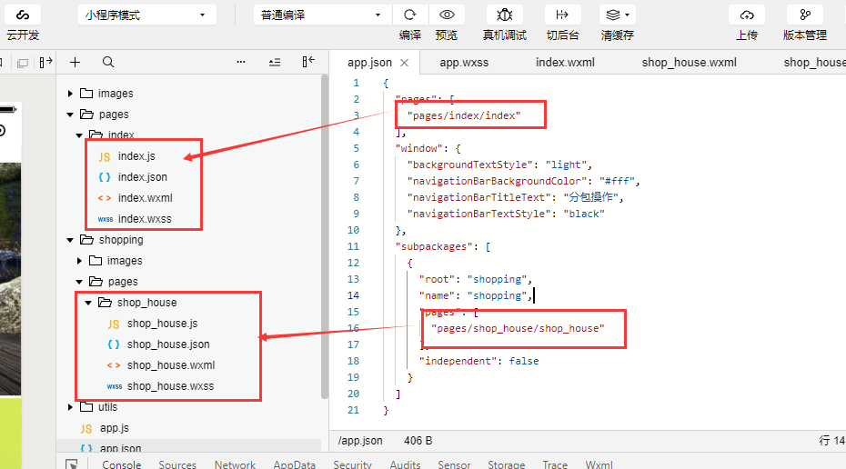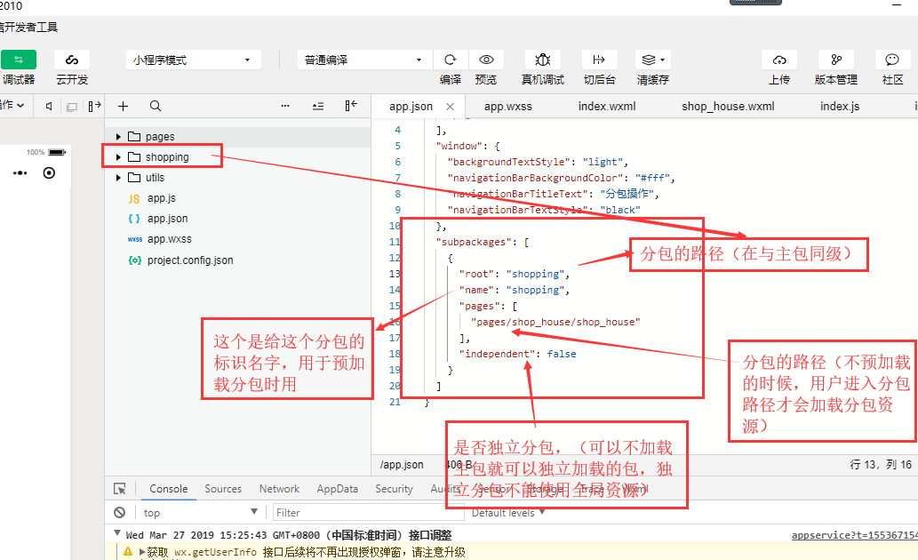 通过我的截图可以看出来,我在根目录创建了一个名为shopping的分包(shopping这个文件夹里面的文件都会打包到分包里面去);