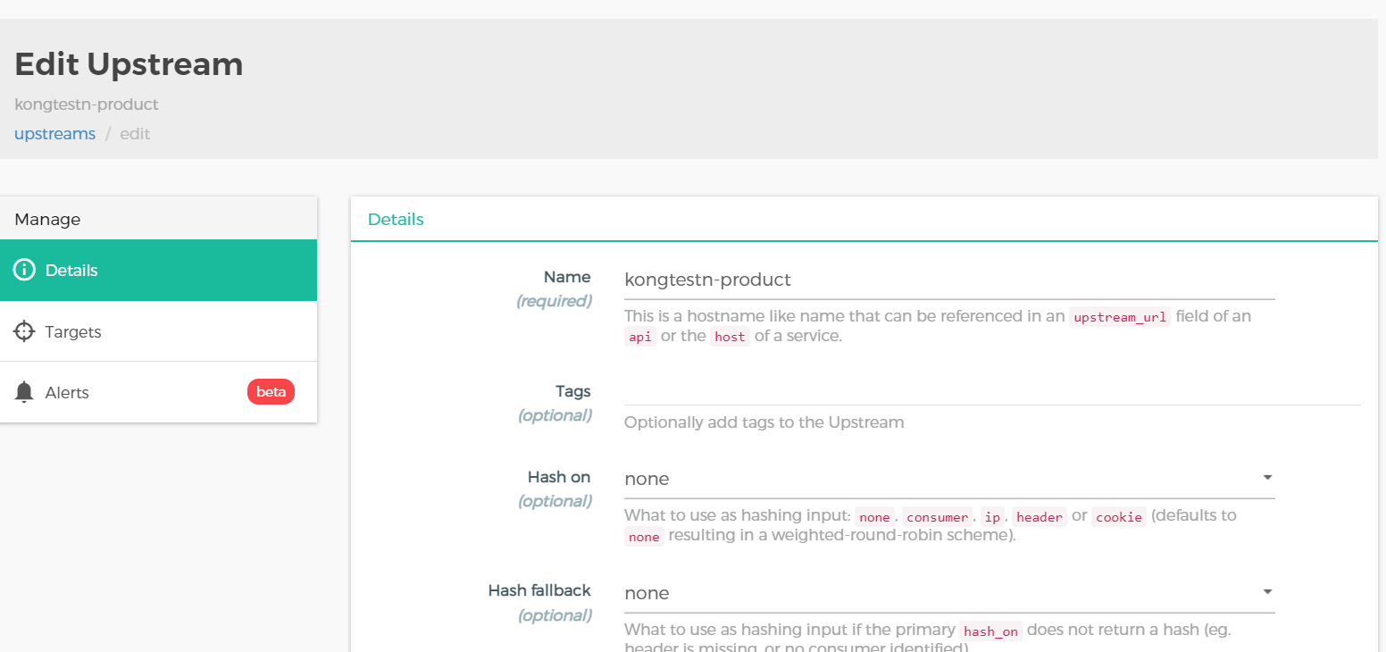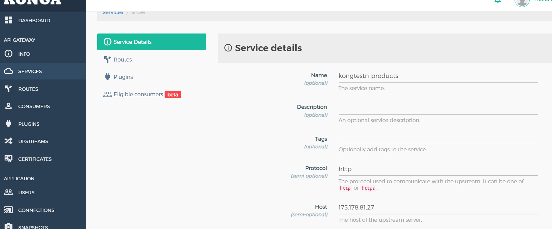 "Kong": { //"Disable": false, //true=禁用 "Host": "http://119.29.92.184:8001", "Services": [ { "Id": "72e21af8-283f-44c4-a766-53de8bb35c21", //guid "Name": "Consultest", "Retries": 5, "Protocol": "http", "Host": "119.29.92.184", "Port": 9999, "Path": null, "Connect_timeout": 60000, //毫秒 "Write_timeout": 60000, "Read_timeout": 60000, "Tags": null } ], "Routes": [ { "Id": "5370e1b7-6c43-442d-9a44-23c249f958f7", "Name": "Consultest", "Protocols": [ "http" ], "Methods": null, "Hosts": null, "Paths": [ "/" ], "Https_redirect_status_code": 307, "Regex_priority": 0, "Strip_path": true, "Preserve_host": false, "Tags": null, "Service": { "Id": "72e21af8-283f-44c4-a766-53de8bb35c21" //这个id跟关联的Services的id一致 } } ] //"Upstream": { // "Id": "8efd15af-df78-422f-97a0-9072fa7e7431", // "Tags": [ "exampleapi", "v1.0" ], // "Name": "configupapi", // "Hash_on": "none", // "Healthchecks": { // "Active": { // "Unhealthy": { // "Http_statuses": [ 429, 500, 501, 502, 503, 504, 505 ], // "Tcp_failures": 1, // "Timeouts": 2, // "Http_failures": 1, // "Interval": 5 // }, // "Type": "http", // "Http_path": "/healthcheck", // "Timeout": 1, // "Healthy": { // "Successes": 1, // "Interval": 20, // "Http_statuses": [ 200, 302 ] // }, // "Https_verify_certificate": true, // "Concurrency": 1 // }, // "Passive": { // "Unhealthy": { // "Http_statuses": [ 429, 500, 501, 502, 503, 504, 505 ] // }, // "Healthy": { // "Http_statuses": [ 200, 201, 302 ] // }, // "Type": "http" // } // }, // "Hash_on_cookie_path": "/", // "Hash_fallback": "none", // "Slots": 10000 //}, //"Target": { // "Tags": [ "exampleapi", "v1.0" ], // "Weight": 100 //} }