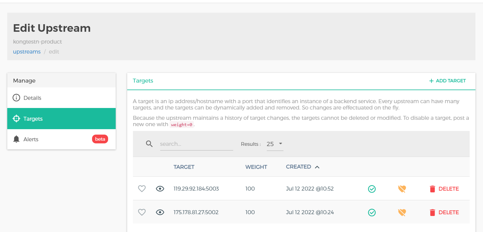 进入konga管理界面也可使用RESTful API进行配置,把routes,services,upstreams,target配置上即可,接着通过8000端口访问