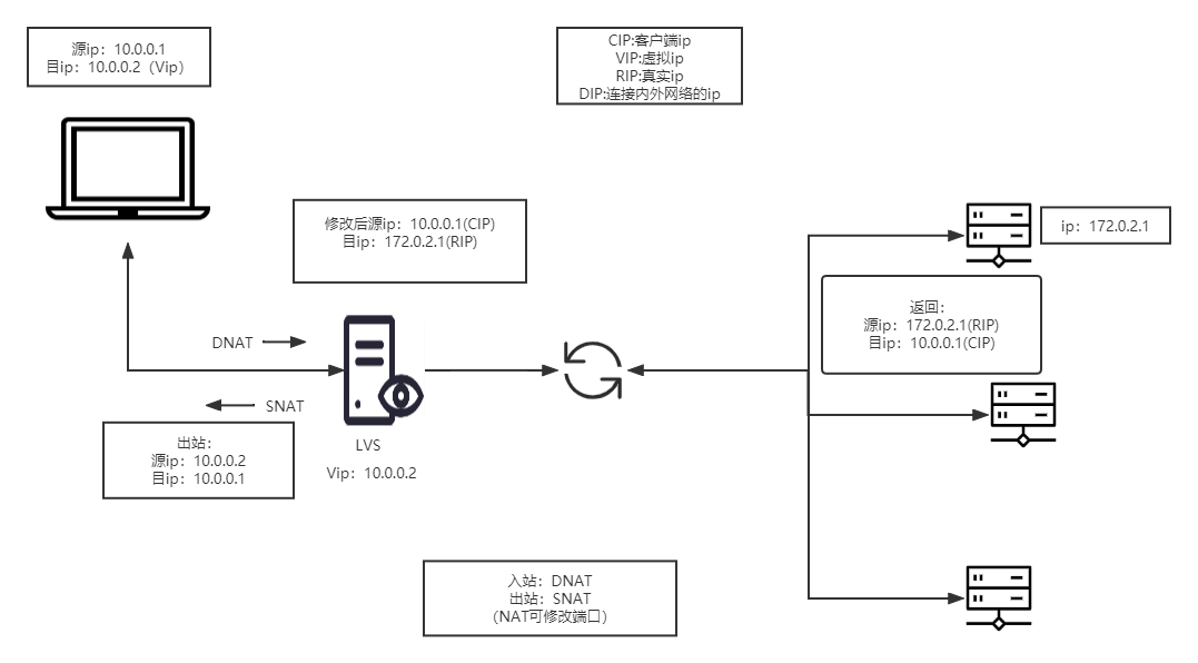 1.nat模式,是在入站的时候更改目的地址目的端口,出站时在调度器更改源地址源端口,