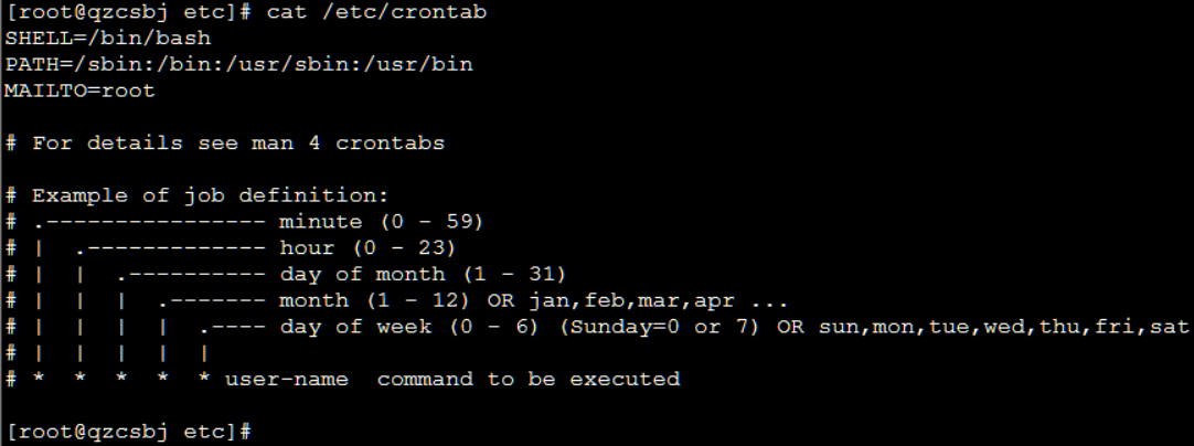 - crontab 文件的格式为" M H D m d cmd " 其中,M代表分钟(0~59),H代表小时(0~23),D代表天(1~31),m代表月(1~12),d代表一星期内的天(0~6,0为星期天)。cmd表示要运行的程序,*代表每分钟都执行。