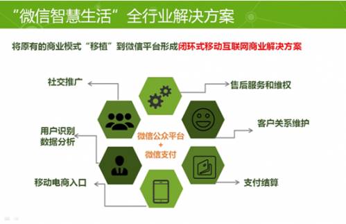 8月28日,微信支付正式公布“微信智慧生活“全行业解决方案,即以微信公众号+微信支付为基础,帮助传统行业将原有商业模式“移植”到微信平台,通过移动电商入口、用户识别、数据分析、支付结算、客户关系维护、售后服务和维权、社交推广等能力形成整套的“闭环式移动互联网商业解决方案”。