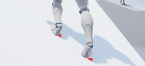 通过射线击中点的法线和Atan2函数计算出脚骨骼的旋转角度,让其贴合斜面。骨骼的旋转基于worldspace叠加计算。