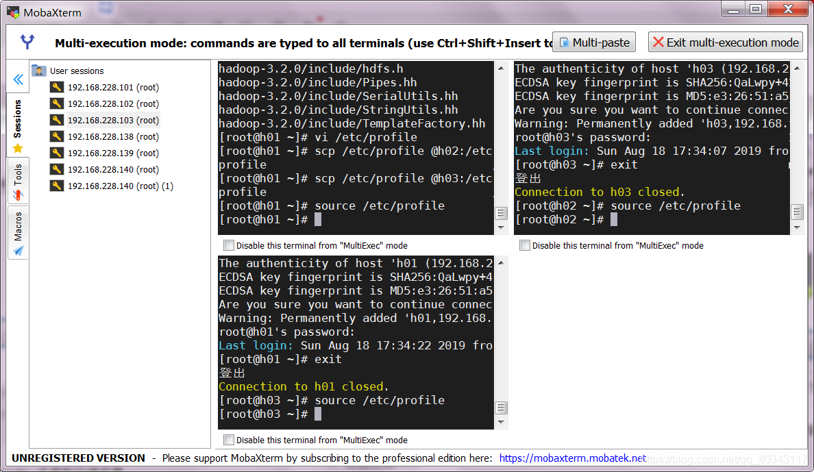 2、 然后我们就可以同时操作三台虚拟机,例如一起输入source /etc/profile来更新环境变量