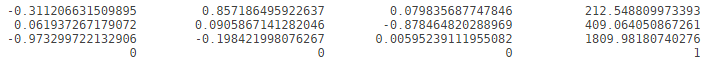 % The translation vector in mm. % Here tx1 means the translation component along x axis at the first position. tx1 = 877; ty1 = -139; tz1 = 218; % The rotation matrix. rotation1 = [-0.9585 0.0277 0.2837; ... 0.0409 0.9983 0.0405; ... -0.2821 0.0504 -0.9581]; % The homogeneous transformation matrix. t1 = [rotation1 [tx1; ty1; tz1]; 0 0 0 1];