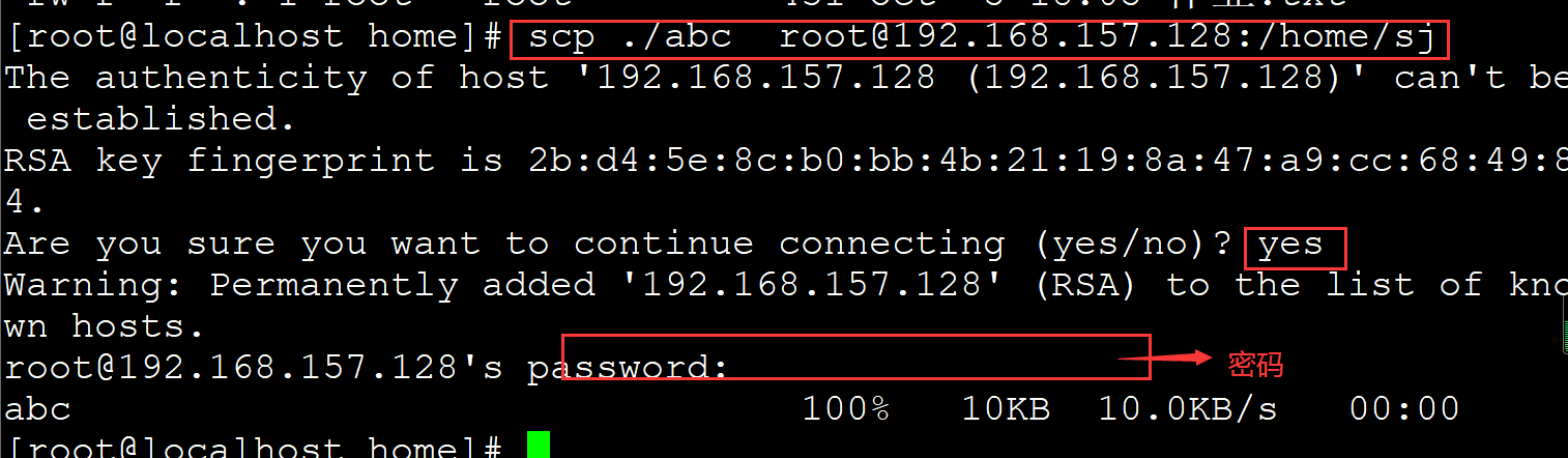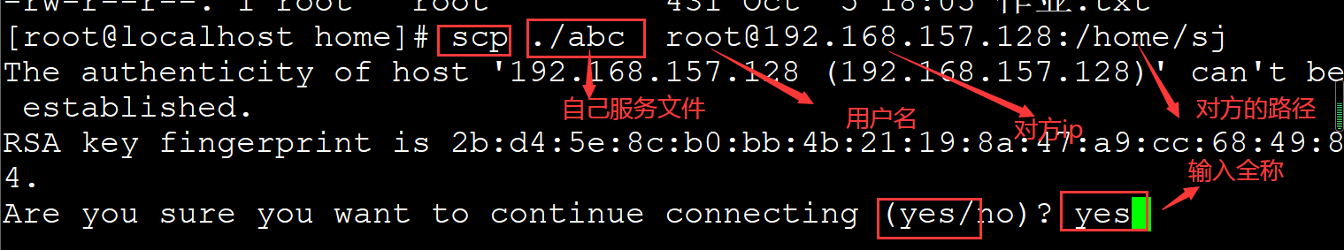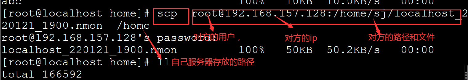 scp +本地文件名称 用户@服务器2ip地址:/保存的路径