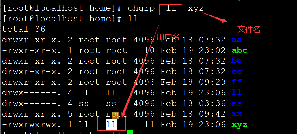 b、chgrp -R 用户名 文件 递归修改目录下所有的子目录和文件的用户名
