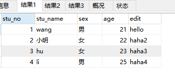 insert into student values(1,'wang','男',21,'hello'),(2,'小明','女',22,'haha2'),(3,'hu','女',23,'haha3'),(4,'li','男',25,'haha4');