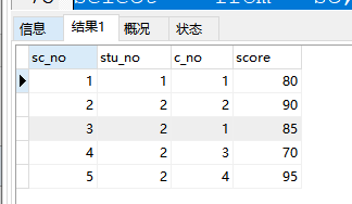 insert into sc values(1,1,1,80),(2,2,2,90),(3,2,1,85),(4,2,3,70),(5,2,4,95),(6,2,5,89);
