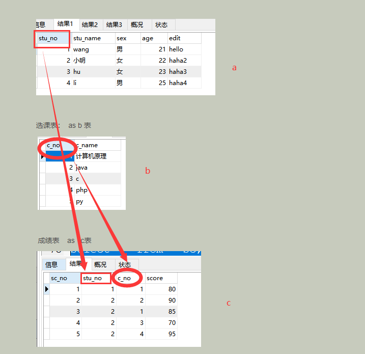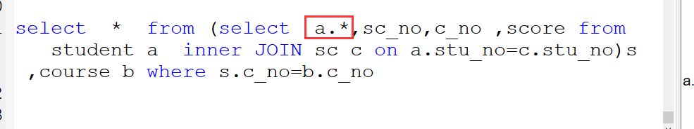 案例:select * from student as a INNER JOIN sc as c on a.stu_no=c.stu_no INNER JOIN course as b on b.c_no=c.c_no