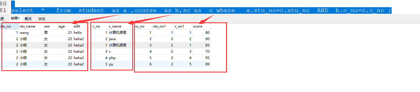 案例:select * from student as a ,course as b,sc as c where a.stu_no=c.stu_no AND b.c_no=c.c_no ;