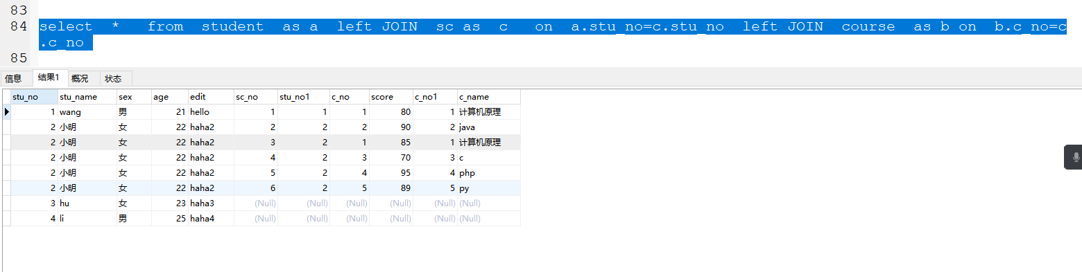 案例:select * from student as a left JOIN sc as c on a.stu_no=c.stu_no left JOIN course as b on b.c_no=c.c_no