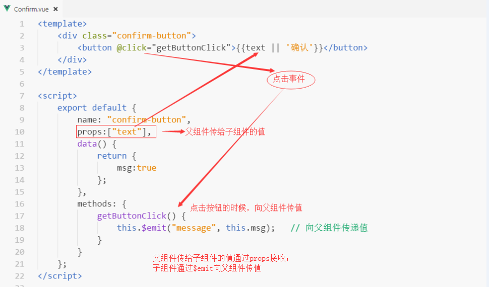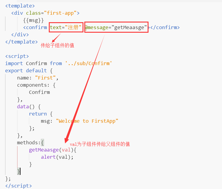 <template > <div class="first-app"></div> {{msg}} <confirm></confirm> </template > import Confirm from '../sub/Confirm' export default{ name:"First". components: { Confirm }, data(){ return{ msg:"nihao" }; } }
