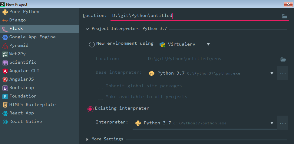 安装好Flask后,在Pycharm中就可以创建Flask的项目程序了,创建的步骤如下图所示。