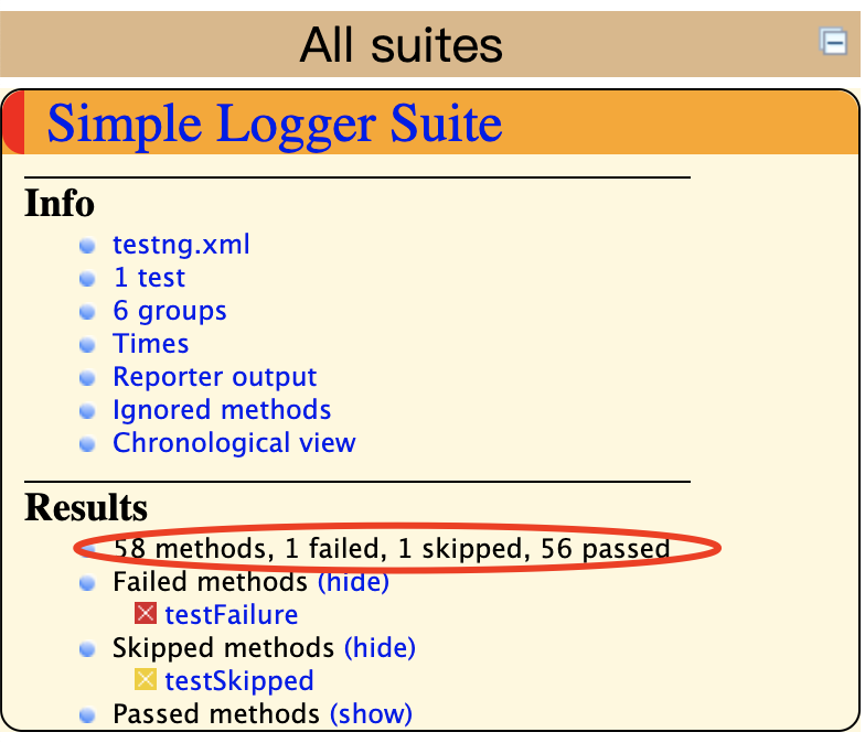 package test.logger; import java.util.List; import java.util.Map; import org.testng.IReporter; import org.testng.ISuite; import org.testng.ISuiteResult; import org.testng.ITestContext; import org.testng.xml.XmlSuite; public class CustomerReporter implements IReporter { @Override public void generateReport(List<XmlSuite> xmlSuites,List<ISuite> suites,String outputDirector) { for(ISuite suite:suites) { String suiteName=suite.getName(); Map<String, ISuiteResult> suiteResults=suite.getResults(); for(ISuiteResult sr:suiteResults.values()) { ITestContext tc=sr.getTestContext(); System.out.println("通过的测试套件 "+suiteName+" is "+tc.getPassedTests().getAllResults().size()); System.out.println("失败的测试套件 "+suiteName+" is "+tc.getFailedTests().getAllResults().size()); System.out.println("忽略的测试套件 "+suiteName+" is "+tc.getSkippedTests().getAllResults().size()); } } } }