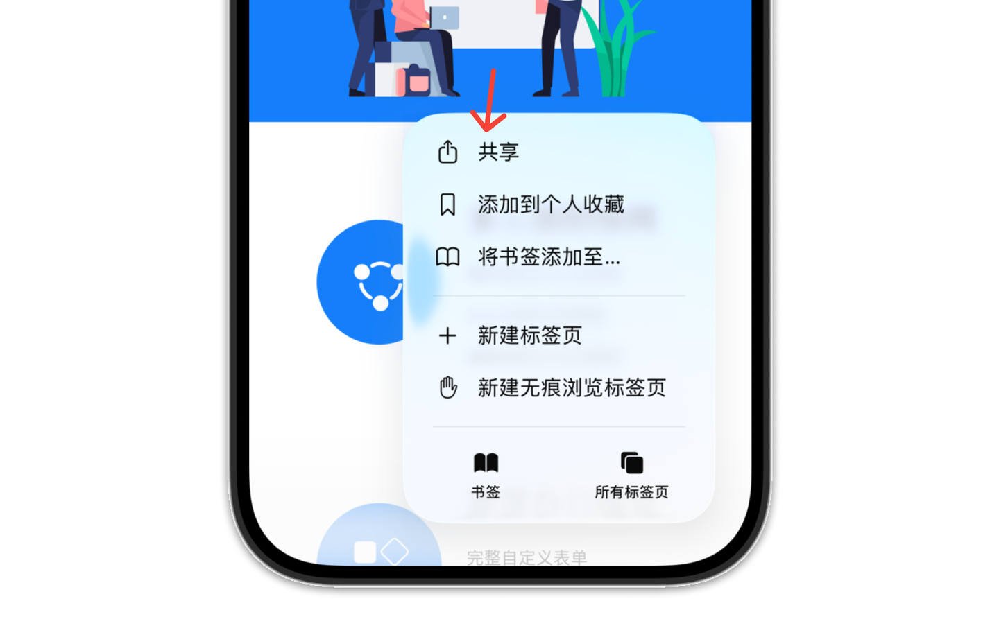 2.点击右上角“共享”,在弹出的菜单面板中点击“更多”