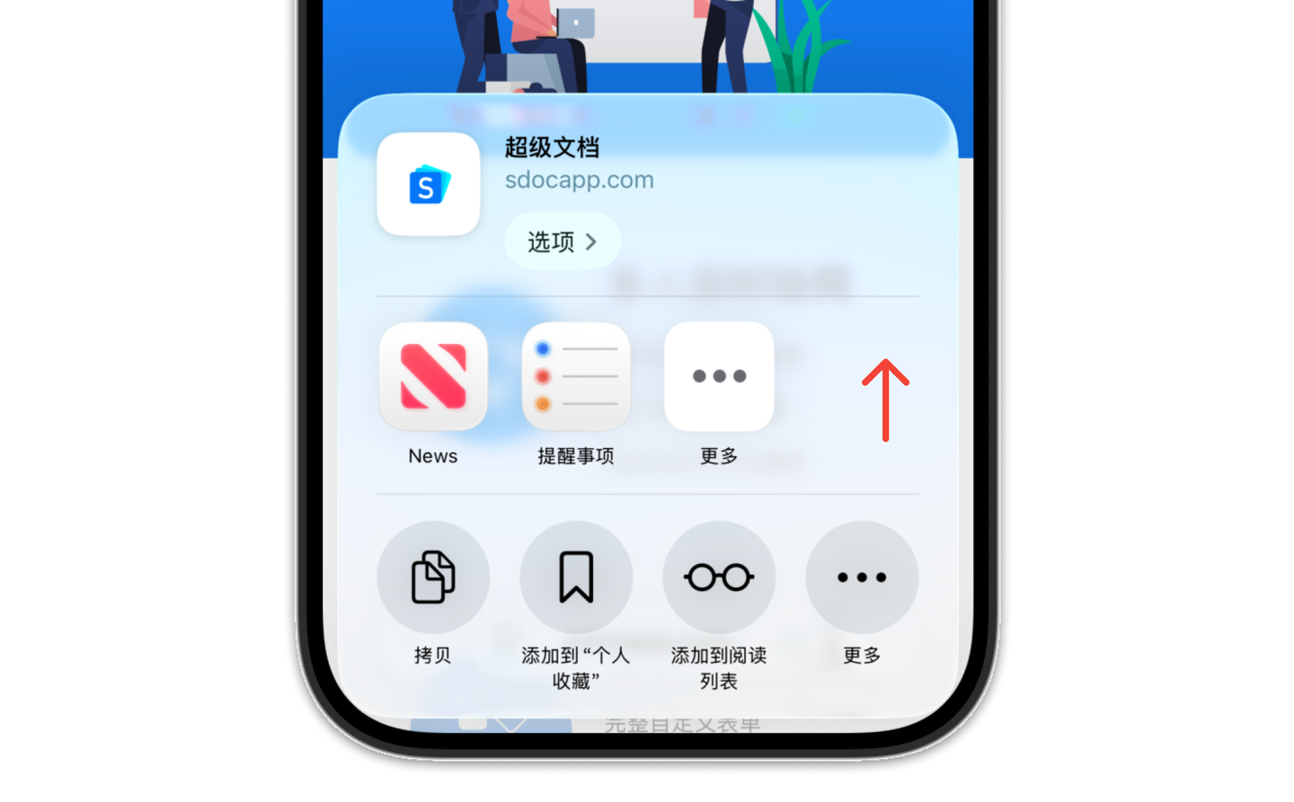 3.在弹出的更多菜单中向下滑动,点击“添加到主屏幕”