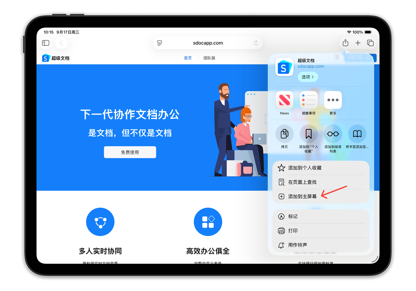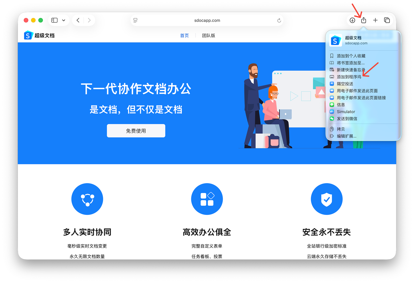 2.点击右上角“共享”,在弹出的菜单面板中点击“添加到程序坞”