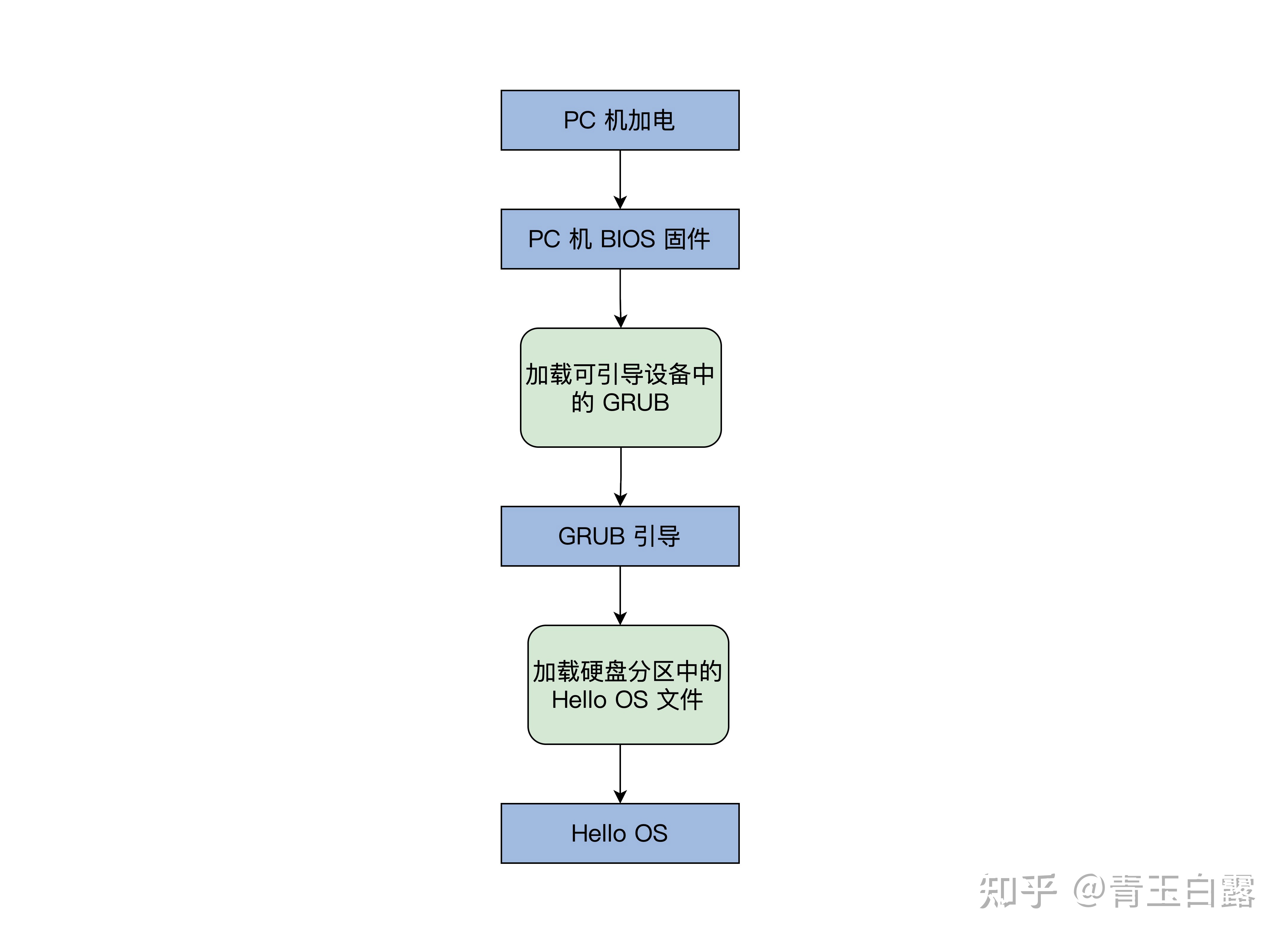 原文:简单解释一下,PC 机 BIOS 固件是固化在 PC 机主板上的 ROM 芯片中的,掉电也能保存,PC 机上电后的第一条指令就是 BIOS 固件中的,它负责检测和初始化 CPU、内存及主板平台,然后加载引导设备(大概率是硬盘)中的第一个扇区数据,到 0x7c00 地址开始的内存空间,再接着跳转到 0x7c00 处执行指令,在我们这里的情况下就是 GRUB 引导程序。