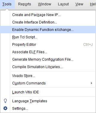 在菜单栏中选择 Tools → Enable Dynamic Function eXchange。此操作将使该工程启用 DFX 功能,注意:此更改不可撤销,建议在启用前进行项目备份。随后点击 Convert,Vivado 会将当前项目转换为 DFX 项目格式。