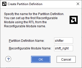 在弹出的对话框中,为分区和可重构模块(Reconfigurable Module,RM)指定名称。分区名称为该 RP 的逻辑标识(如