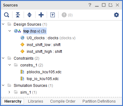 shift实例将显示为黄色菱形图标,表示它们已被标记为 RP。此外,界面还将新增 Partition Definitions 标签页,用于管理所有已定义的 RP 和 RM 实例。Vivado 还会为初始 RM 启动一条 OOC 综合运行流程。