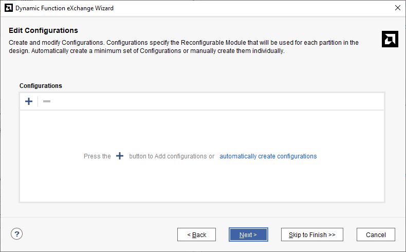 进入 Edit Configurations 页面。配置定义表示完整系统镜像(Image),包括静态设计及其在各 RP 上的 RM 映射关系。我们可以在 DFX 向导中创建任何所需的配置集,或者简单地让 DFX 向导自动选择。