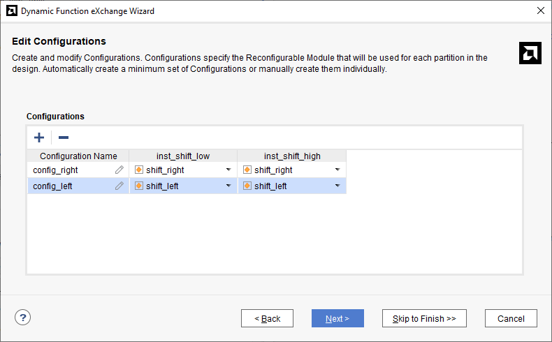 执行此选项之后,Vivado 将创建拥有两个配置的最小集合,以包含所有的 RP 对应 RM 的映射组合。每个 shift 实例将在第一个配置中分配为 shift_right,在第二个配置中分配为 shift_left。每个配置的名称是可以修改的,如下图所示,配置的名称已经修改为 config_right 和 config_left,以反映每个模块中包含的可重构模块。