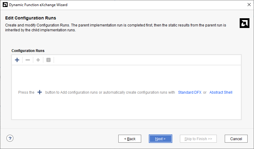 对于 UltraScale+ 设备,请使用 Standard DFX 以用最小运行集填充配置运行页面,并支持使用 Abstract Shell 配置不同的运行。对于 7 系列或 UltraScale 设备,选择 automatically create configuration runs 选项,而且不支持使用 Abstract Shell 生成配置。