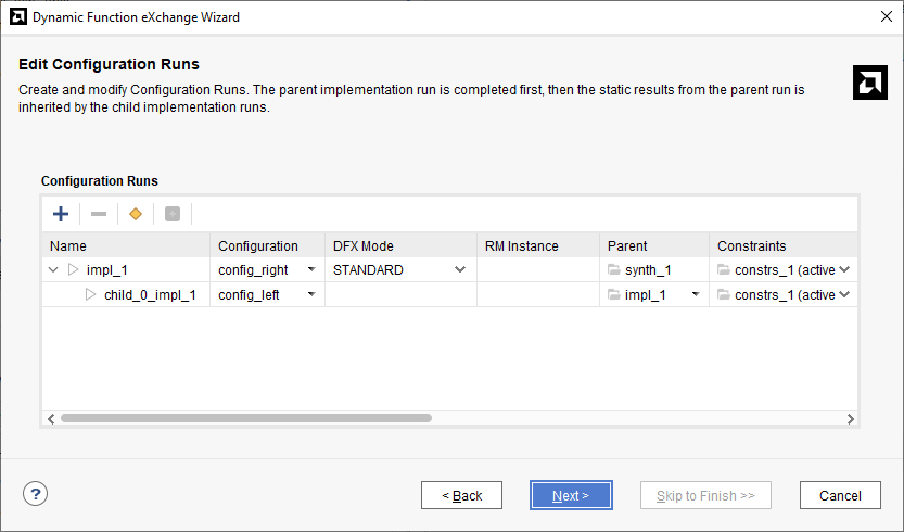 本实验选择 Standard DFX,Vivado 会自动构建两个运行,分别对应父配置 config_right 和子配置 config_left 。你可以在该页面中添加更多运行,或为任一运行设置特定的约束与综合策略。