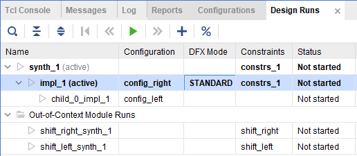 在 DFX 向导中更新设计之后,可以看到 Design Runs 标签中已更新状态。DFX 向导为 shift_left RM 添加了一个 OOC Synthesize 运行,并在父运行(impl_1)下创建了一个子运行(child_0_impl_1)。