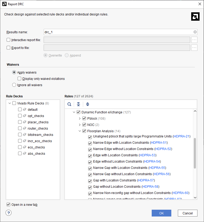 对于 7 系列设备,建议启用 SNAPPING_MODE 以自动修正边界对齐问题,特别是与 Clock Region 和 INT 列相关的错误。如果你创建了自定义的布局规划,并且报告了 DRC 问题,请在继续之前修复这些问题。