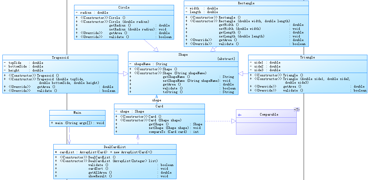 按照题目的要求设计类,设计Card 类 implements 接口Comparable,设计父类Shape 及其子类Circle, Rectangle, Triangle ,Trapezoid,设计DealCardList类,其属性为ArrayList<Card> cardList = new ArrayList<Card>(); 在DealCardList的带参构造方法中对属性cardlist添加内容。