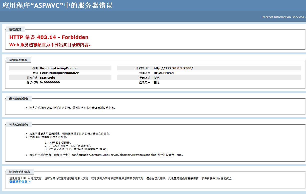 发布mvc4报错:403.14-Forbidden Web 服务器被配置为不列出此目录的内容。可能在部署ASP.NET MVC4.0的时候会发现这个问题,特别是在.NET4.5时,配置文件中不包含这个配置。建议配置。(这种方式笔者并没有用过,笔者的电脑用上面的第一种解决方式就配置ok了,这个补充的是分享一次百度经验。)