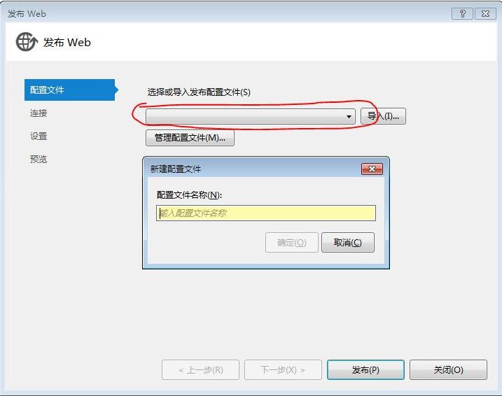 2、在弹出的发布Web对话框中,选择配置文件,选择<新建...>, 在弹出的新建配置文件对话康中,输入配置文件名称,如下图所示: