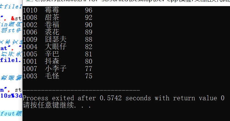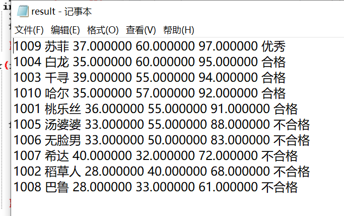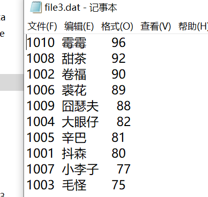 1.屏幕上出现了分数由高到低的排序信息。也生成了file3.dat文件,其中的信息直观可读