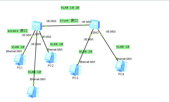 LSW1 里的 VLAN 10 能 ping 通 LSW2 里的 VLAN 10