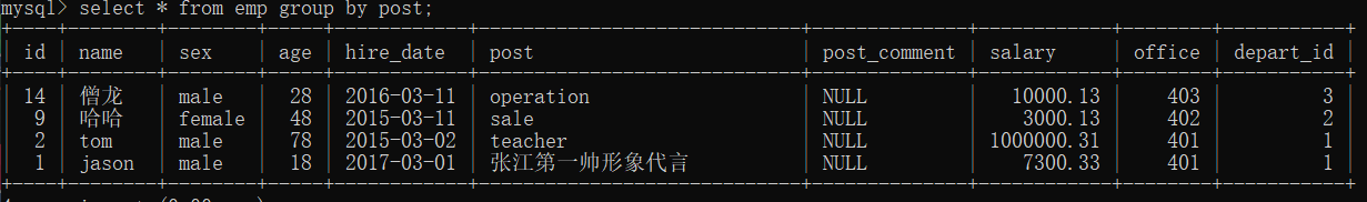 ('jason','male',18,'20170301','浦东第一帅形象代言',7300.33,401,1), #以下是教学部