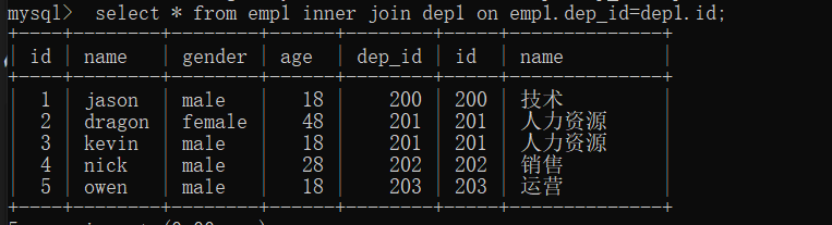 select * from emp1 inner join dep1 on emp1.dep_id=dep1.id;
