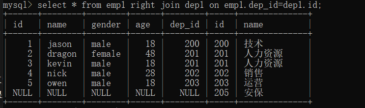select * from emp1 right join dep1 on emp1.dep_id = dep1.id;