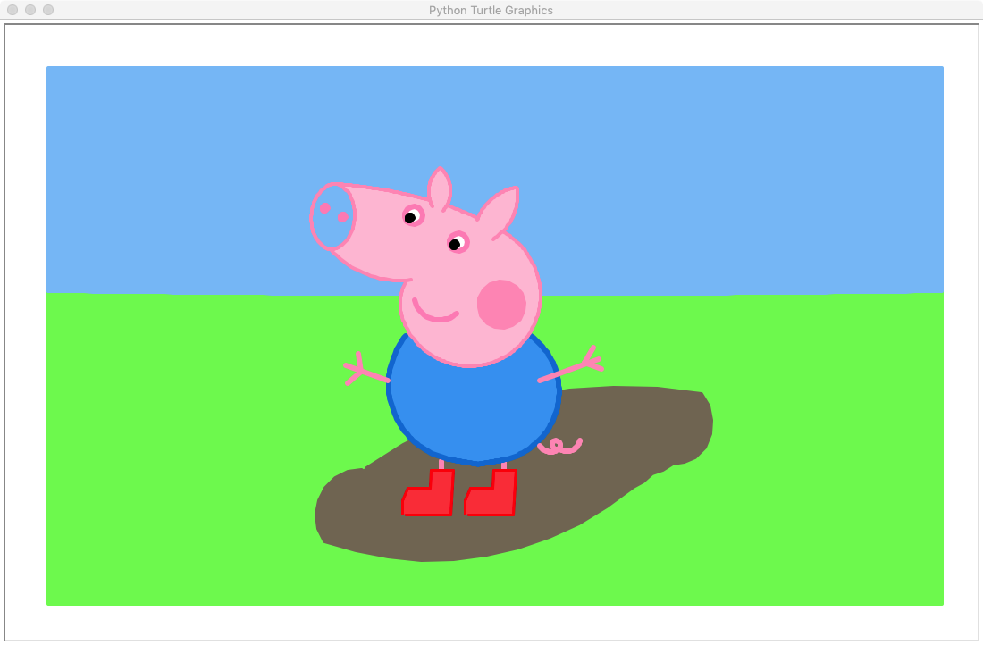 import turtle as t ''' t.pu() 提起画笔 t.pd() 移动时绘制图形,缺省时也为绘制 t.seth 设置当前朝向为angle角度 t.begin_fill() 准备开始填充图形 t.color 同时设置pencolor=color1, fillcolor=color2 t.goto 设置笔的坐标 t.circle(70,20) 半径 度数 15,124,215 乔治裤子颜色外面 66,163,242 乔治裤子颜色里面 134 196 247 天空的颜色 123,245,95 草地的颜色 253,6,6 鞋子外面 253,70,70 鞋子里面 130,119,100 泥坑 ''' r_a=0.8 wight = 1100 height = 700 #t.pensize(4) t.hideturtle() t.colormode(255) t.color((255,155,192),"pink") t.setup(wight,height) t.speed(10) def move_pen(x,y): t.pu() t.goto(x-wight/2+50,y-height/2+50) t.pd() def pen_set(size,r1,g1,b1,r2=0,g2=0,b2=0): t.pensize(size) t.color((r1,g1,b1),(r2,g2,b2)) def draw_grid(): pen_set(1,0,0,0,0,0,0) for i in range(20): move_pen(0+i*50,0) t.seth(90) t.fd(600) for i in range(12): move_pen(0,0+i*50) t.seth(0) t.fd(1000) def draw_bg(): #画草地 move_pen(0,350) pen_set(4,123,245,95, 123,245,95) t.begin_fill() t.seth(-90) t.fd(350) t.seth(0) t.fd(1000) t.seth(90) t.fd(350) t.end_fill() #画天空 move_pen(0,350) pen_set(4,134,196,247, 134,196,247) t.begin_fill() t.seth(90) t.fd(250) t.seth(0) t.fd(1000) t.seth(-90) t.fd(250) a=-180 + r_a for i in range(50): a = a - r_a/50 t.seth(a) t.fd(500/50) a =180 for i in range(50): a = a - r_a/50 t.seth(a) t.fd(500/50) t.end_fill() def draw_mud_pit(): #画泥坑 pen_set(5,130,119,100, 130,119,100) move_pen(350,150) t.begin_fill() t.seth(-180) t.circle(50,125) t.seth(-20) t.circle(350,60) t.seth(20) t.circle(50,30) t.seth(10) t.circle(50,30) t.seth(0) t.circle(50,30) t.seth(40) t.circle(50,90) t.seth(170) t.circle(500,45) t.end_fill() def draw_shoes(): pen_set(3,253,6,6, 253,70,70) move_pen(400,100) t.begin_fill() t.seth(0) t.fd(50) t.seth(87) t.fd(50) t.seth(180) t.fd(25) t.seth(-93) t.fd(20) t.seth(-180) t.fd(25) t.seth(-120) t.circle(45,38) t.end_fill() move_pen(470,100) t.begin_fill() t.seth(0) t.fd(50) t.seth(87) t.fd(50) t.seth(180) t.fd(25) t.seth(-93) t.fd(20) t.seth(-180) t.fd(25) t.seth(-120) t.circle(45,38) t.end_fill() def draw_leg(): pen_set(6,255,155,192, 255,155,192) move_pen(440,140) t.seth(90) t.fd(20) move_pen(510,140) t.seth(90) t.fd(20) def draw_trousers(): move_pen(400,300) pen_set(6,15,124,215, 66,163,242) t.begin_fill() d_a = 100 a=-130 for i in range(60): a = a + 2 t.seth(a) t.fd(3) for i in range(14): a = a + 0.02 t.seth(a) t.fd(2) a = 0-a for i in range(14): a = a + 0.02 t.seth(a) t.fd(2) for i in range(60): a = a + 2.2 t.seth(a) t.fd(3) t.end_fill() def draw_tile(): move_pen(550,177) pen_set(6,255,155,192, 255,155,192) a=-60 for i in range(25): a = a + 4 t.seth(a) t.fd(1) t.circle(5) a = -a for i in range(30): a = a + 4 t.seth(a) t.fd(1) def draw_hands(): move_pen(550,250) pen_set(6,255,155,192, 255,155,192) t.seth(20) t.fd(70) move_pen(600,270) t.seth(60) t.fd(20) move_pen(600,270) t.seth(-20) t.fd(20) move_pen(380,250) t.seth(160) t.fd(50) move_pen(350,260) t.seth(100) t.fd(20) move_pen(350,260) t.seth(-140) t.fd(20) def draw_face(): move_pen(400,360) pen_set(4,255,155,192, 255,196,218) t.begin_fill() a=-120 for i in range(20): a = a + 2.5 t.seth(a) t.fd(2.2) for i in range(130): a = a + 1.3 t.seth(a) t.fd(1.8) for i in range(35): a = a + 1.4 t.seth(a) t.fd(2) for i in range(50): a = a + 0.35 t.seth(a) t.fd(2) for i in range(50): a = a + 0.2 t.seth(a) t.fd(2) n=0.4 for i in range(180): if 0<=i<30 or 60<=i<90 or 120<=i<150 : n=n+0.08 t.lt(3) #向左转3度 t.fd(n) #向前走a的步长 else: n=n-0.08 t.lt(3) t.fd(n) a=-50 for i in range(20): a = a + 2.8 t.seth(a) t.fd(5) t.end_fill() def draw_other(): move_pen(310,440) pen_set(6,255,145,192, 255,145,192) t.begin_fill() t.circle(3) t.end_fill() move_pen(330,430) t.begin_fill() t.circle(3) t.end_fill() pen_set(6,255,145,192, 255,255,255) move_pen(410,425) t.begin_fill() t.circle(10) t.end_fill() move_pen(460,395) t.begin_fill() t.circle(10) t.end_fill() pen_set(6,0,0,0,0,0,0) move_pen(405,429) t.begin_fill() t.circle(3) t.end_fill() move_pen(455,399) t.begin_fill() t.circle(3) t.end_fill() move_pen(510,310) pen_set(6,255,155,192, 255,155,192) t.begin_fill() t.circle(25) t.end_fill() move_pen(410,340) pen_set(6,255,145,192, 255,145,192) a=-80 for i in range(20): a = a + 6 t.seth(a) t.fd(3) move_pen(430,445) pen_set(4,255,155,192, 255,196,218) t.begin_fill() a=120 for i in range(40): a = a - 2 t.seth(a) t.fd(1.2) a=-a for i in range(45): a = a - 2 t.seth(a) t.fd(1.2) t.end_fill() move_pen(480,430) t.begin_fill() a=70 for i in range(40): a = a -1.5 t.seth(a) t.fd(1.5) a=-80 for i in range(45): a = a -1.5 t.seth(a) t.fd(1.5) t.end_fill() draw_bg() draw_mud_pit() #draw_grid() draw_leg() draw_shoes() draw_trousers() draw_tile() draw_hands() draw_face() draw_other() t.mainloop()