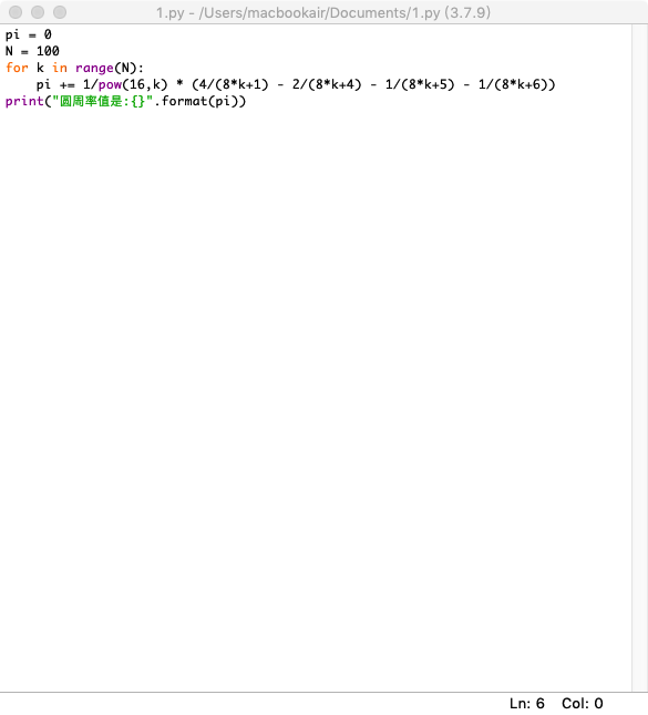 pi = 0 N = 100 for k in range(N): pi += 1/pow(16,k) * (4/(8*k+1) - 2/(8*k+4) - 1/(8*k+5) - 1/(8*k+6)) print("圆周率值是:{}".format(pi))