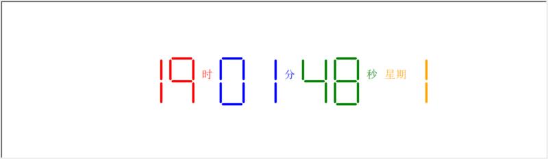 import turtle, datetime def drawGap(): turtle.up() turtle.fd(5) def drawLine(draw): drawGap() if(draw): turtle.down() else: turtle.up() turtle.fd(40) drawGap() turtle.right(90) def drawDigit(i): if i in [2,3,4,5,6,8,9]: drawLine(True) else: drawLine(False) if i in [0,1,3,4,5,6,7,8,9]: drawLine(True) else: drawLine(False) if i in [0,2,3,5,6,8]: drawLine(True) else: drawLine(False) if i in [0,2,6,8]: drawLine(True) else: drawLine(False) turtle.left(90) if i in [0,4,5,6,8,9]: drawLine(True) else: drawLine(False) if i in [0,2,3,5,6,7,8,9]: drawLine(True) else: drawLine(False) if i in [0,1,2,3,4,7,8,9]: drawLine(True) else: drawLine(False) turtle.right(180) turtle.penup() turtle.fd(20) def drawData(time): turtle.pencolor("red") for i in time: if i=='$': turtle.write("时",font=("Arial",18,"normal")) turtle.pencolor("blue") turtle.fd(40) elif i=='/': turtle.write("分",font=("Arial",18,"normal")) turtle.pencolor("green") turtle.fd(40) elif i=='*': turtle.write("秒",font=("Arial",18,"normal")) turtle.pencolor("orange") turtle.fd(40) elif i=='@': turtle.write("星期",font=("Arial",18,"normal")) turtle.fd(40) else: drawDigit(eval(i)) def main(): turtle.setup(1200,350,200,200) turtle.speed(100) turtle.pensize(5) turtle.penup() turtle.fd(-300) turtle.hideturtle() drawData(datetime.datetime.now().strftime('%H$%M/%S*@%u')) turtle.mainloop() main()