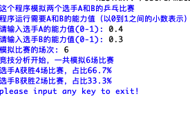 from random import random def printInfo(): print("这个程序模拟两个选手A和B的乒乓比赛") print("程序运行需要A和B的能力值(以0到1之间的小数表示)") def getInputs(): a = eval(input("请输入选手A的能力值(0-1): ")) b = eval(input("请输入选手B的能力值(0-1): ")) n = eval(input("模拟比赛的场次: ")) return a, b, n def simNGames(n, probA, probB): winsA, winsB = 0, 0 for i in range(n): scoreA, scoreB = simOneGame(probA, probB) if scoreA > scoreB: winsA += 1 else: winsB += 1 return winsA, winsB def gameOver(a,b): if a>=10 and b>=10: if abs(a-b)==2: return 1 elif a<10 and b<10: if a==11 or b==11: return 1 else: return 0 def simOneGame(probA,probB): scoreA,scoreB=0,0 serving="A" while not gameOver(scoreA,scoreB): if serving=="A": if random()<probA: scoreA+=1 else: serving="B" else: if random()<probB: scoreB+=1 else: serving="A" return scoreA,scoreB def printSummary(winsA,winsB): n=winsA+winsB print("竞技分析开始,一共模拟{}场比赛".format(n)) print("选手A获胜{}场比赛,占比{:0.1%}".format(winsA,winsA/n)) print("选手B获胜{}场比赛,占比{:0.1%}".format(winsB,winsB/n)) def main(): printInfo() probA,probB,n=getInputs() winsA,winsB=simNGames(n,probA,probB) printSummary(winsA,winsB) main() python3: input("please input any key to exit!")